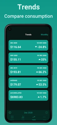 - Statistics - Trends - Groups - Tips and Tricks - Dark Mode - Multi-tariff meters (e.g Day/Night tariff) - Conversions (e.g Gas m³ to kWh) - Consumption formulas - Reading reminders - Import from CSV - Export to CSV - Backup and restore