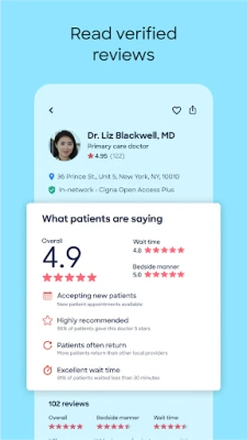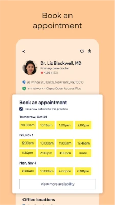 Search by specialty or symptom, along with location, availability, and insurance, to see providers who are in-network. Research and compare providers by reviewing their profiles, which include professional statements, education background, photos, and verified reviews and ratings from other patients.
